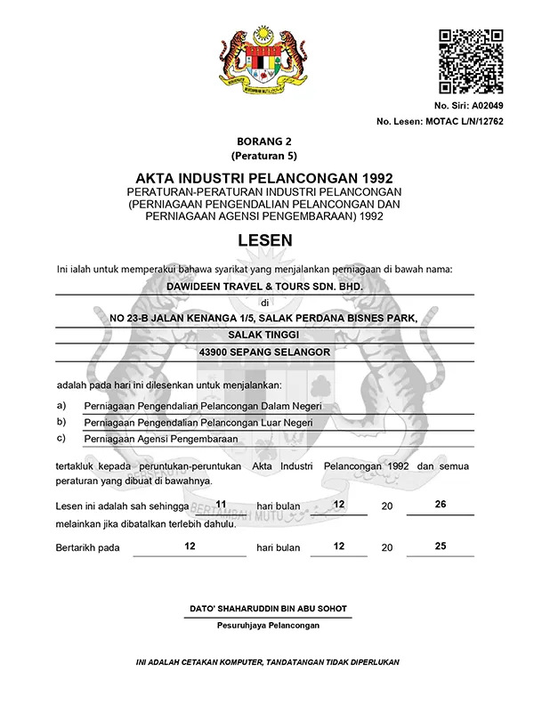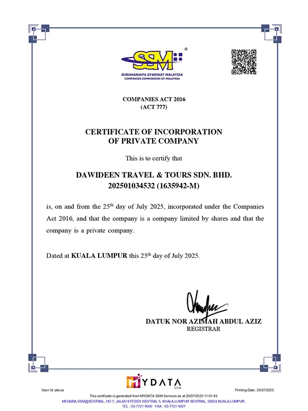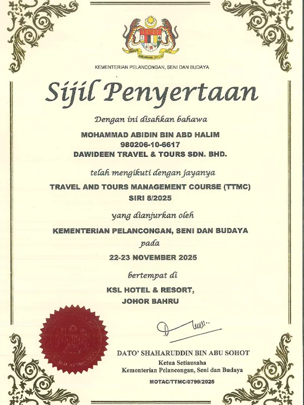 With increasing client demand for comprehensive services including private car, van, bus bookings, and customized travel packages, Mr. Mohammad Abidin Bin Abd Halim decided to form an official company under the name DAWIDEEN TRAVEL & TOURS SDN. BHD.